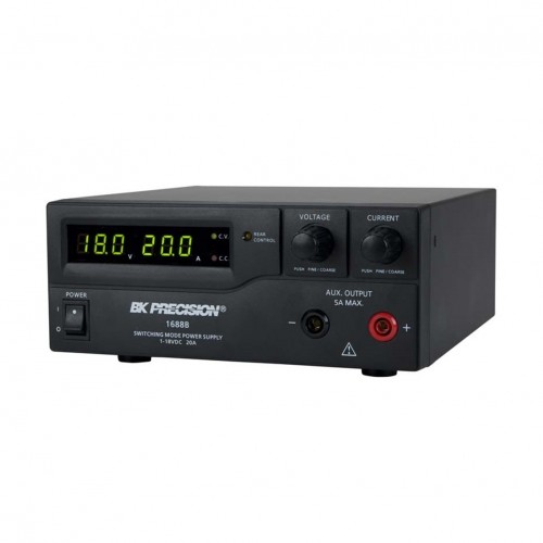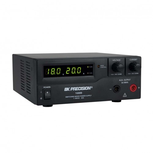 The B&K Precision 1685B, 1687B, and 1688B switching mode DC power supplies provide various configurations of high output voltage or high output current in a small, lightweight form factor. In addition to their constant voltage (CV) and constant current (CC) modes, these high efficiency DC power supplies offer unique preset and remote control modes. Up to three different presets of voltage and current values can be saved for quick recall through a rear switch. For remote control, an analog remote control terminal is accessible on the rear, or use the USB interface to communicate with the power supply via PC software or remote commands. These features make the 1685B, 1687B, and 1688B suitable for a wide range of applications including production testing, telecommunications, R&D, electronic field service, and university labs.