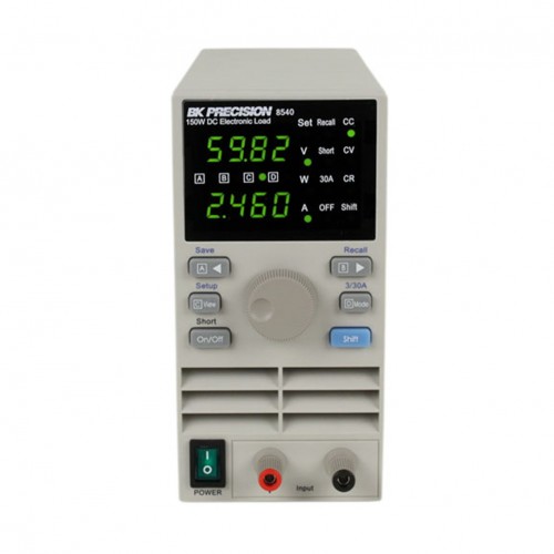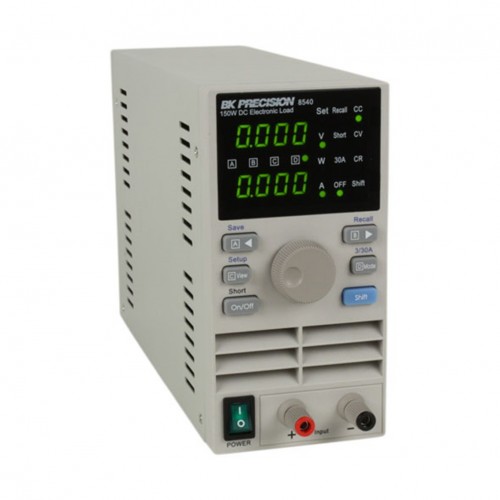 The 8540 DC electronic load is a very compact, economically priced instrument that is at home on both the bench and the production floor. Though this is an instrument in a small package, it can reliably test a 5 volt power supply to 30 amps and do it continuously. The load can operate in CC, CV or CR mode while voltage/current or resistance/power values are measured and displayed in real time, making it well suited to test a variety of DC power sources. The 8540's performance is comparable to most full size bench DC electronic loads, yet it does the job at half the price and takes up half the space on your bench.